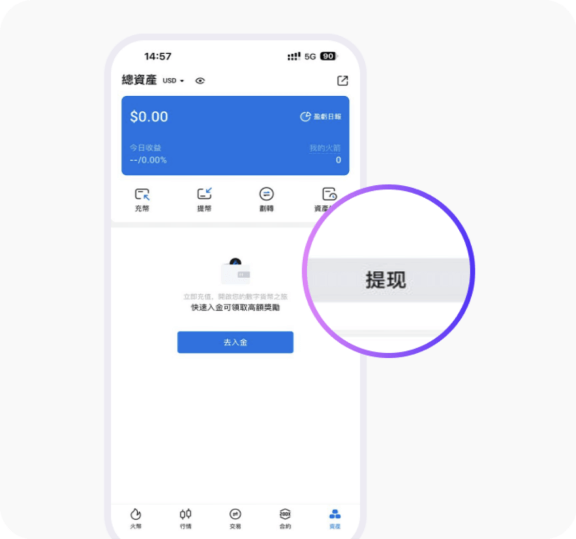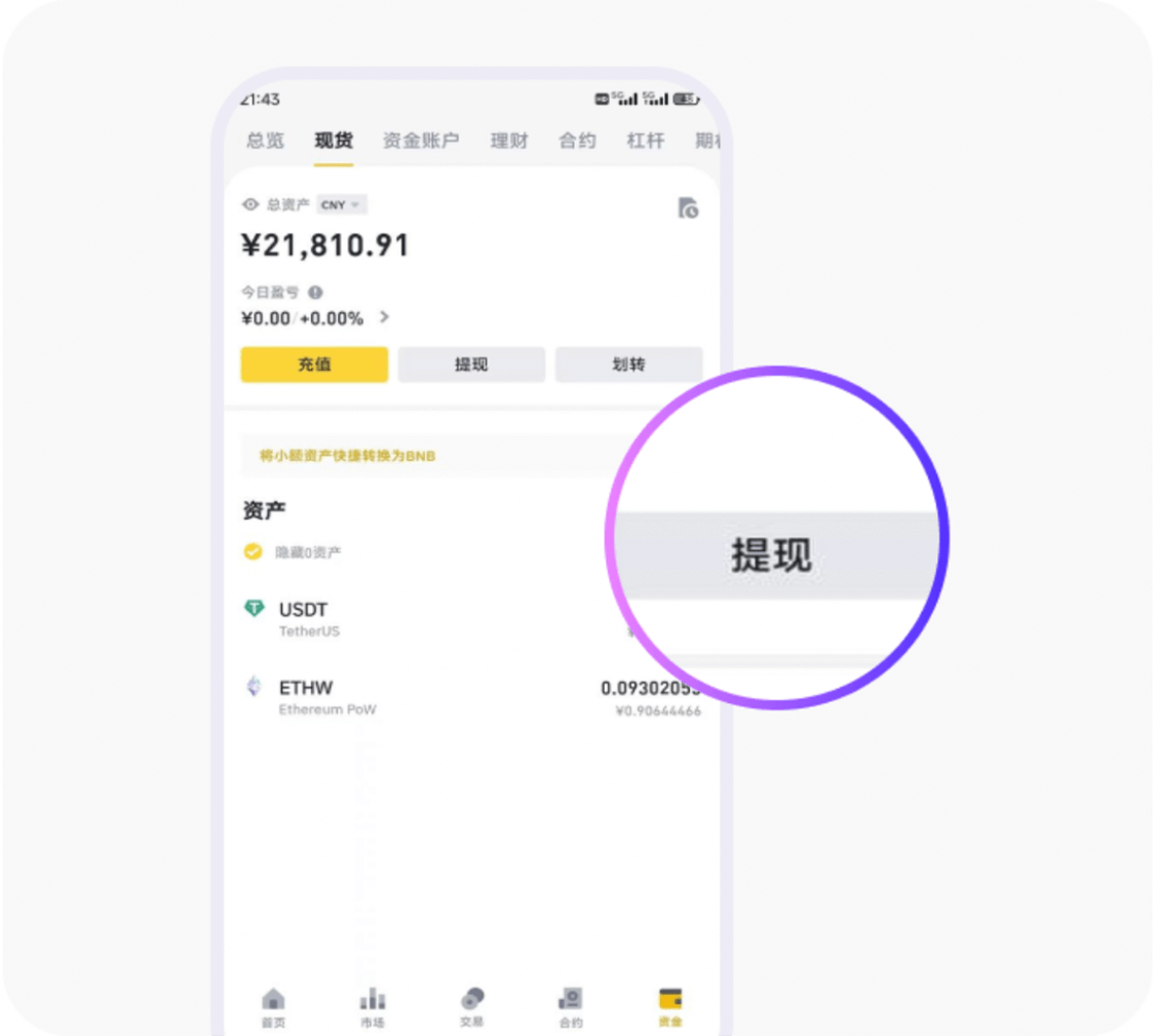 第一步:在【资金】页面,选择“现货”,点击提现按钮