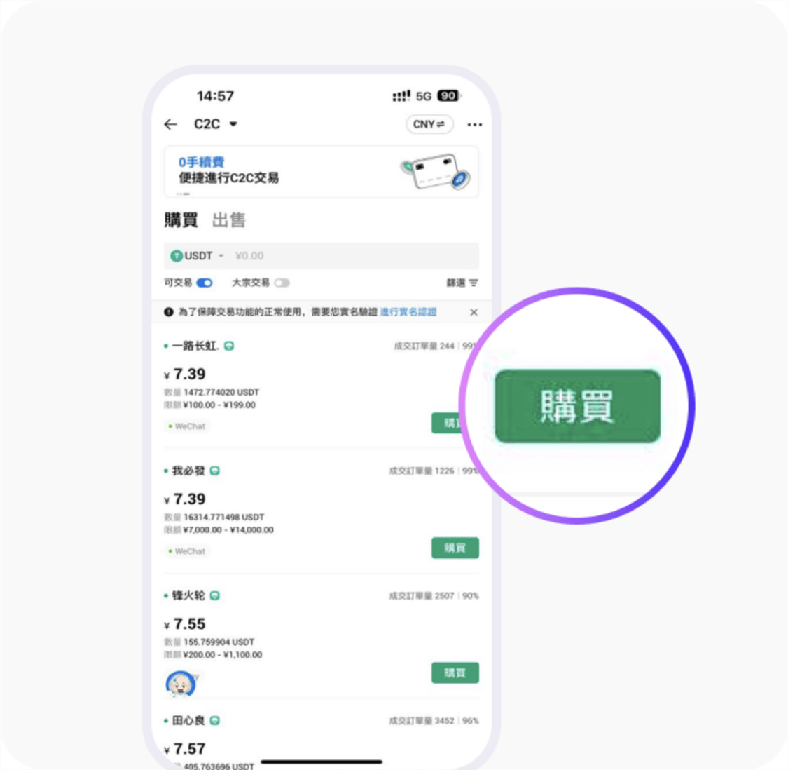 您也可以选择在C2C交易中选择商家购买,具体步骤 - 打开OKX App首页,点击【买币】- 【C2C 买币】。在购买页面,点击【USDT】可以搜索数字资产,点击【筛选】可以选择委托单类型和支付方式。设置完成后,选出符合条件的商家,点击【购买】。
