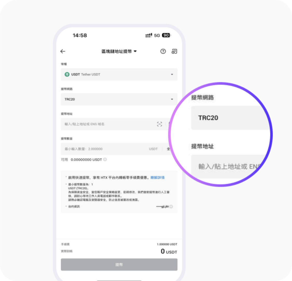 提币网络选择择“TRC-20”或“ERC-20”,地址填写“第三步”获取的充值收币地址,输入金额后,点击提现按钮。