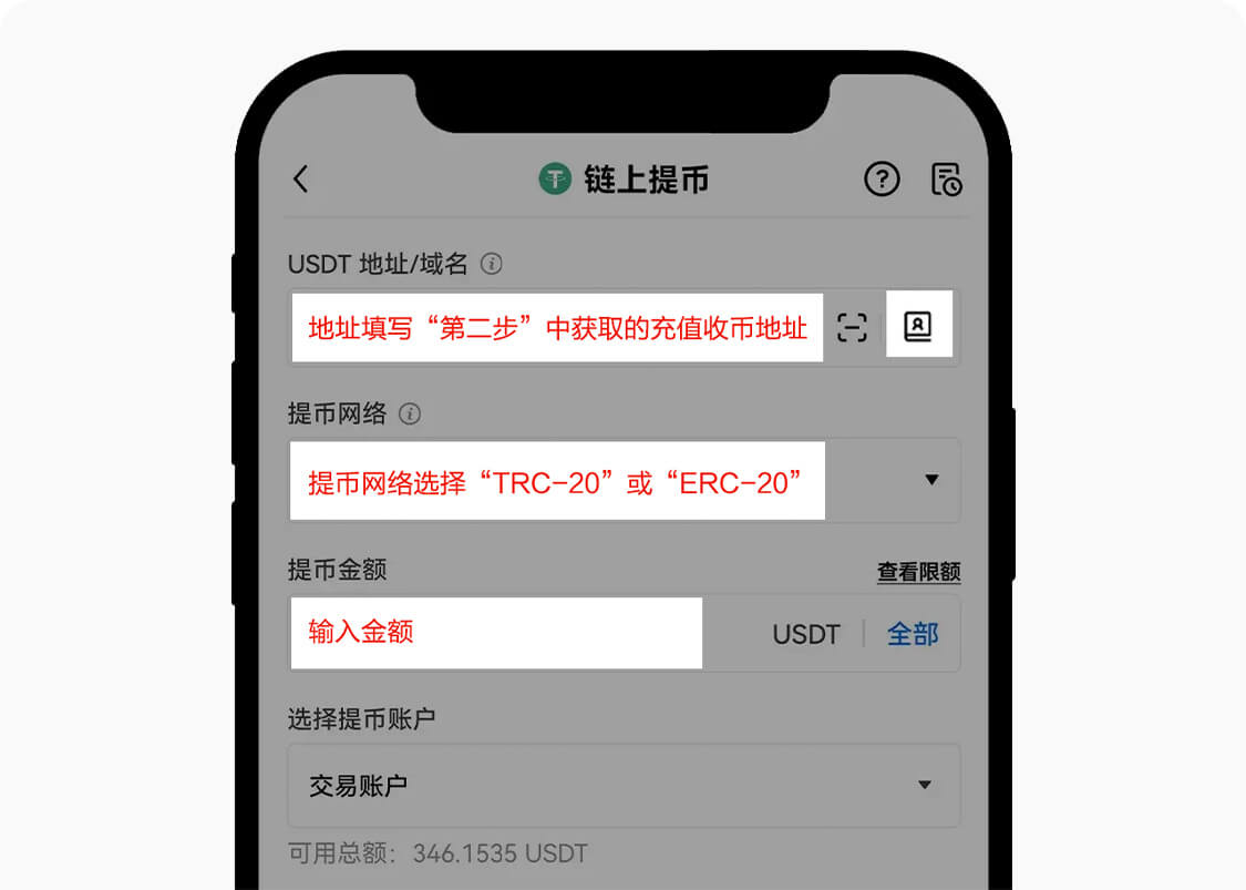 选择USDT,然后选择“区块链转账”,提币网络选择“TRC-20”或“ERC-20”,地址填写“第二步”中获取的充值收币地址,输入金额后,点击提现按钮。